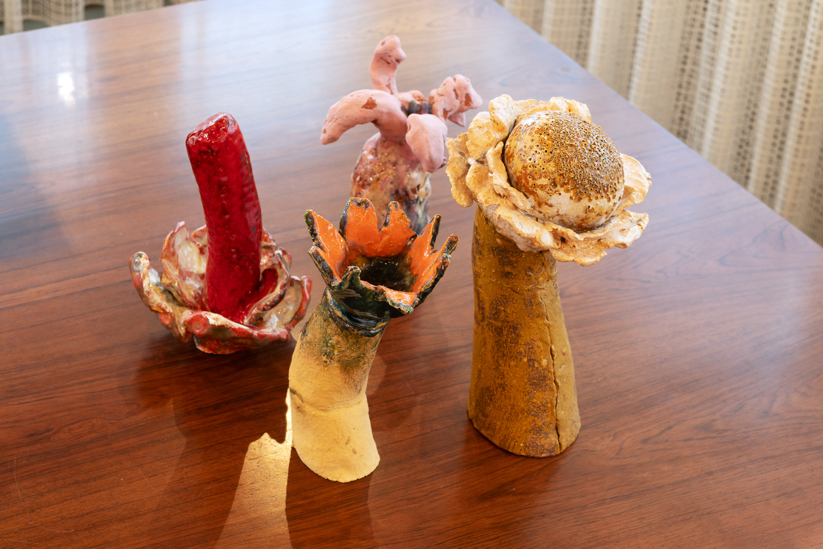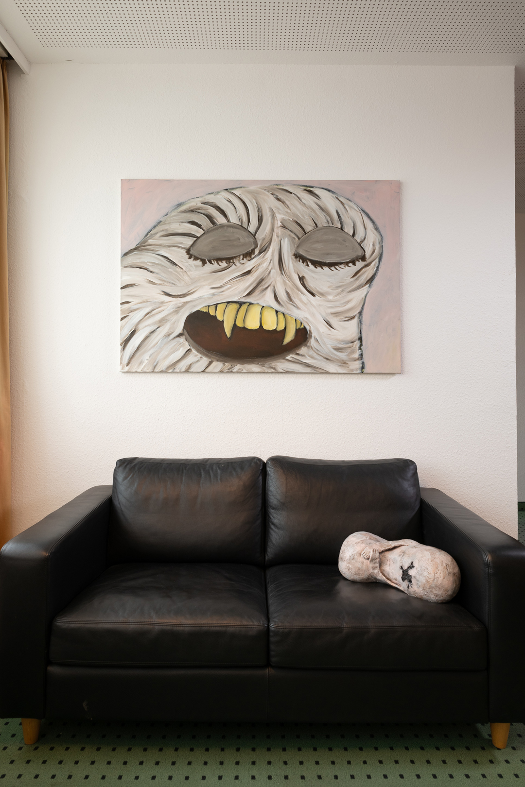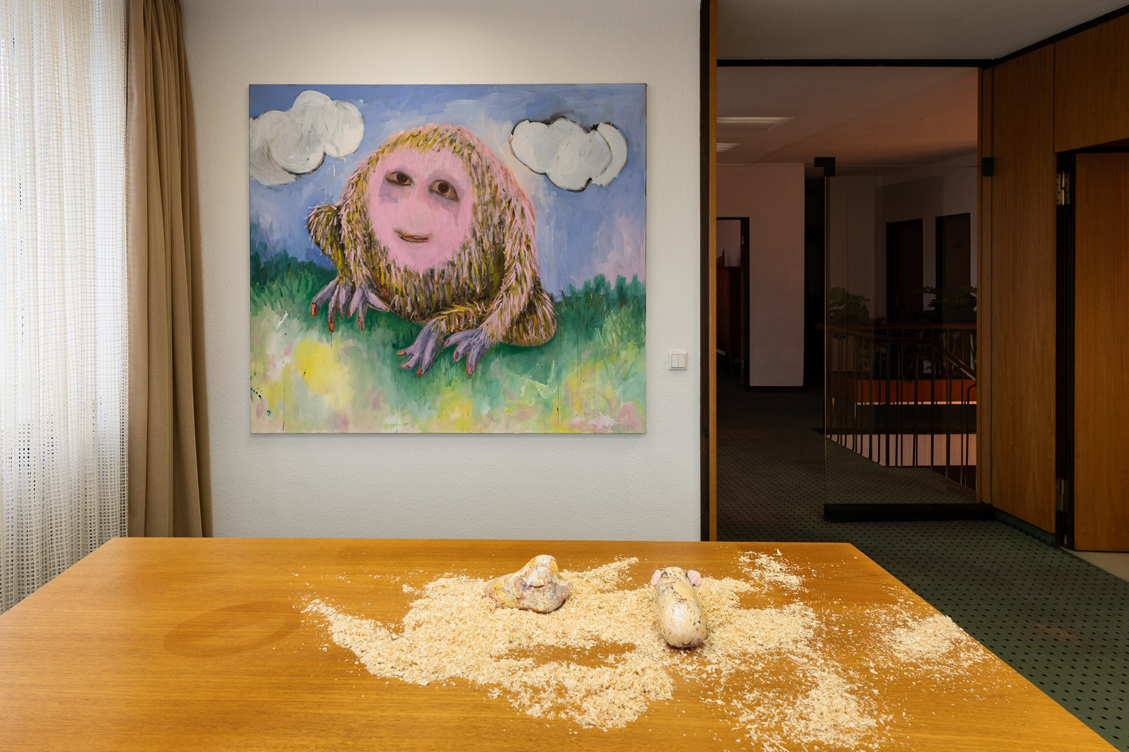 In his solo exhibition at LeBureau, Harry Hachmeister (*1979 in Leipzig, lives in Berlin) presents new and early works. Starting with self-portraits, he works between photography, drawing, painting and ceramics, which he brings together in often expansive installations quoting domestic or urban space to create open narratives, including fitness studios, building sites or, as here, the office building he has found. With a great deal of humour and play, Hachmeister's works arise from his preoccupation with bodies (human, animal, plant) and their attributions, materialized as ambivalent intermediate stages.